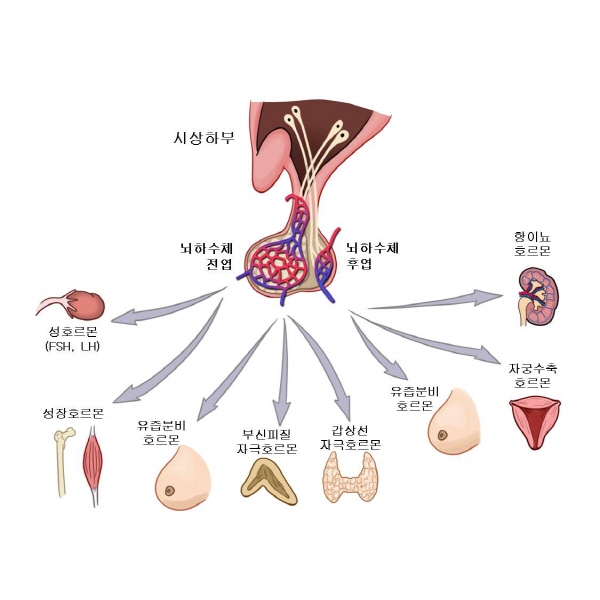 뇌하수체 조절: 뇌하수체 호르몬은 시상하부에서 합성되고, 뇌하수체 전엽의 호르몬은 시상하부에서 생산된 호르몬에 따라 조절됩니다. 시상하부는 뇌하수체에서 생산되는 호르몬을 조절합니다. 시상하부에서 조절하는 뇌하수체 호르몬으로는 성장호르몬방출호르몬, 성장호르몬억제호르몬, 프로락틴방출호르몬, 프로락틴억제호르몬, 코르티코트로핀분비호르몬, 갑상선자극호르몬방출호르몬, 생식샘자극호르몬, 옥시토신이 있습니다.