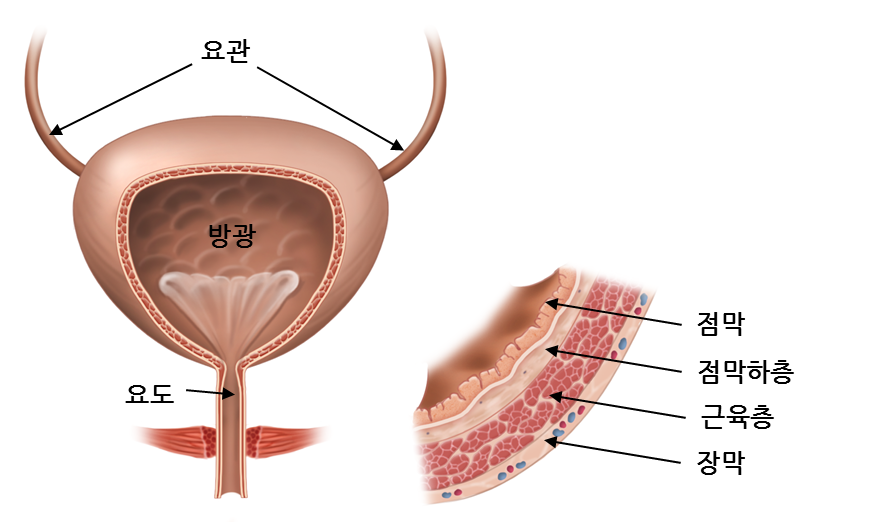 성인 방광의 평균용적은 약 400ml 정도입니다. 방광은 속이 빈 주머니 모양의 근육이며 점막, 점막하조직, 근육, 장막의 4개의 층으로 이루어져 있습니다. 방광은 위로 신장에서 내려오는 요관과 연결되어 있고, 아래로는 요도와 연결되어 있습니다.