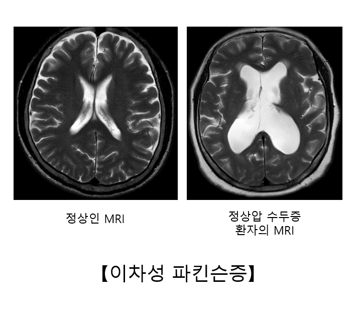 정상압 수두증은 뇌 전산화 단층촬영(CT)이나 뇌 자기공명영상(MRI)에서 뇌실이 커져 있는 소견이 확인됩니다. 척수 천자를 통해 뇌척수액을 배액했을 때 일시적으로 파킨슨 증상이 호전되면 진단할 수 있습니다. 이러한 경우 뇌실복강션트라는 수술을 하면 지속적으로 뇌척수액을 배액하여 증상을 호전시킬 수 있습니다.