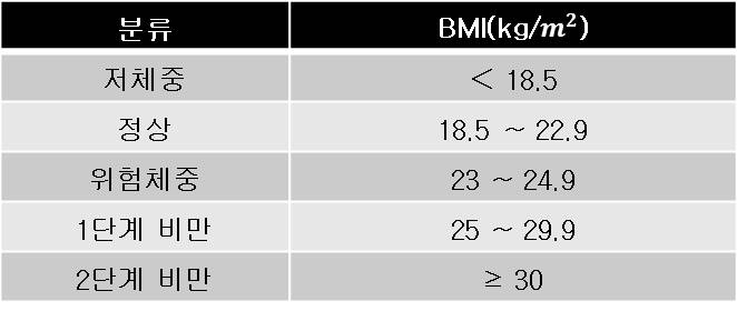 ▶저체중 : 비만 관련 질환의 위험성은 낮으나 골다공증과 같은 질환의 위험성이 높아질 수 있습니다.