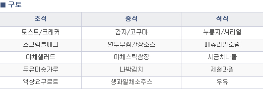 토스트, 시리얼, 샌드위치, 냉 과일 샐러드, 찬 고기요리, 크래커