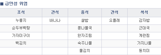 1. 급성 위염에는 1-2일 정도 금식하고 차츰 미음, 죽식, 일반식으로 이행합니다.