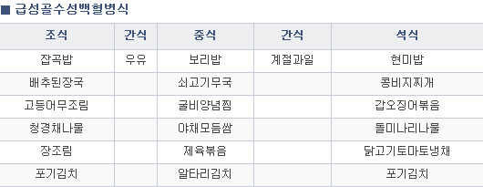 골수 이식 직후에는 감염을 예방하기 위하여 익힌음식 위주로 섭취하며 빠른 회복을 도모하기 위해 균형잡힌 고른 식품섭취를 하도록 합니다.